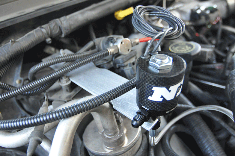 Up next The Nissan Titan Surfcamp is a Mobile Beach Hut Published on July 10, 2018 Author Mike McGlothlin Tags 7.3L, diesel performance, ford, nitrous, power stroke, Share article Facebook 0 Twitter 0 Mail 0 PROJECT 600 HP 7.3L INSTALLING A NITROUS EXPRESS SYSTEM ON OUR ’00 F-250 Over the course of the last year, our ’00 F-250 has been subjected to a long list of modifications. Hybrid injectors, an upgraded fuel supply system, higher volume HPOP, fire-ringed heads, GTP38R turbo, built 4R100 transmission, and custom tuning have all made their way onto the truck in an effort to help the build live up to its name: Project 600 HP 7.3L. To ensure we get as close to our horsepower goal as possible, we’re throwing one last power-adder at the 7.3L Power Stroke this month: nitrous oxide. Designed for diesels with factory to moderate fuel systems, the Stacker 2 nitrous system from Nitrous Express is a safe, cost-effective way to add up to 150 hp to your combination. The NX kit employs a 0.093 orifice Lightning series solenoid, -4 AN braided stainless feed lines, a 15-pound nitrous bottle with NX’s 45-degree bottle valve, and all fittings and necessary installation hardware. The Stacker 2 system retails for $641.63. For an even distribution point, we planned to have the nitrous enter the 7.3L engine’s intake stream through the intake Y that feeds boost to each cylinder head. With boosted air already having been routed through the intercooler by the time it reaches this point, we believe it’s the best place to introduce nitrous. We began the install by threading the N2O filter fitting into the inlet port of the Lightning solenoid. This fitting’s screen-type filter is good insurance against any debris making it into the solenoid, as any trash that makes it into the solenoid can hang it open. It’s also important to note that Teflon tape should not be employed when installing the nitrous solenoid fittings into the solenoid. Nitrous Express supplies its own thread sealer with each Stacker kit it sells. As for wiring up the system, NX supplies a wiring harness that accommodates a 30-amp relay. The relay controls the opening and closing of the solenoid, while a micro switch (also included) activates the relay traditionally at wide open throttle. Since we wanted to be able to turn on or off the nitrous whenever we felt the need, we decided to use our own switch, you’ll see it later on. The relay is basically a remote switch so you don’t have to run large wires into the cab and back out to the solenoid. In order for it to work it needs a supply of power from the battery; a ground to chassis; a lead to the solenoid; and a feed in from the switch in the cab. Both the solenoid and relays were grounded using an existing ground on the firewall. Before we mounted the relay and secured the wire harness where we wanted it (out of harm’s way and away from additional sources of heat), the wiring was wrapped in plastic wire loom. This added a layer of protection to our wires, but also made for a clean look. We don’t want to call attention to anything other than the nitrous solenoid. At this point we also ran the remaining wire (switch) through the firewall into the cab to be hooked up later. In an install such as this, it’s important to mock up the solenoid, fittings, feed line(s), and wire routing before you decide to mount anything. We ended up mounting the aforementioned solenoid relay and its respective wiring harness next to the brake fluid reservoir. Once we’d decided where the nitrous solenoid was going to go (above the A/C receiver-dryer), we fabricated a quick mounting bracket using some 2-inch aluminum flat stock. Two Phillips head machine screws secure the solenoid to the mounting bracket. With the solenoid mounted, the supplied inlet and outlet fittings were installed next. After that, one end of the -4 AN braided stainless feed line that spans from the solenoid to the engine (labeled “out”) was attached to the solenoid. Wiring up the Lightning solenoid is very basic. The unit has just two wires: one for the switch and one for ground. The switch wire we then ran to the relay. By incorporating a raised inlet and bottom exit feature into its Lightning solenoids, NX eliminates up to four 90-degree turns and one expansion area in this solenoid body. No sharp bends or expansion areas mean nitrous doesn’t have a chance to become gaseous. Instead, it stays in liquid form longer—which means more power can be made. It’s worth mentioning that, while the included thread sealer was used to install the inlet and outlet port fittings into the solenoid, none should be used when the feed lines are attached to the fittings. Before moving forward with the install we pressurized the system (with the solenoid off of course) with the 15-lb NX bottle and checked for leaks with a little soapy water. No bubbles means no leaks. The wire we ran earlier into the cab will be tied in now. It needs a positive voltage signal inorder to activate the solenoid. So we grabbed a “key on” power source from a wire running tothe radio, ran that to the arming switch (the one with the red cover for safety), from that switchwe ran it to this pistol grip style hand held switch for easy activation on the track. This way thesystem will only work if both switches are on. With everything wired up and mounted, it was time to test the solenoid to ensure it’d been installed (and would work) properly. After confirming the nitrous bottle was off and that no pressure was present in the supply line, we toggled the arming switch to the on position and activated the system until we heard the solenoid click. And then, well, because we just couldn’t wait (do not do this), we cable-tied the line from the solenoid, opened the bottle and pressed the button a couple times. Last connection under the hood was plumbing the feed line from the solenoid into the intake. We used a plug from Riffraff Diesel that installs in place