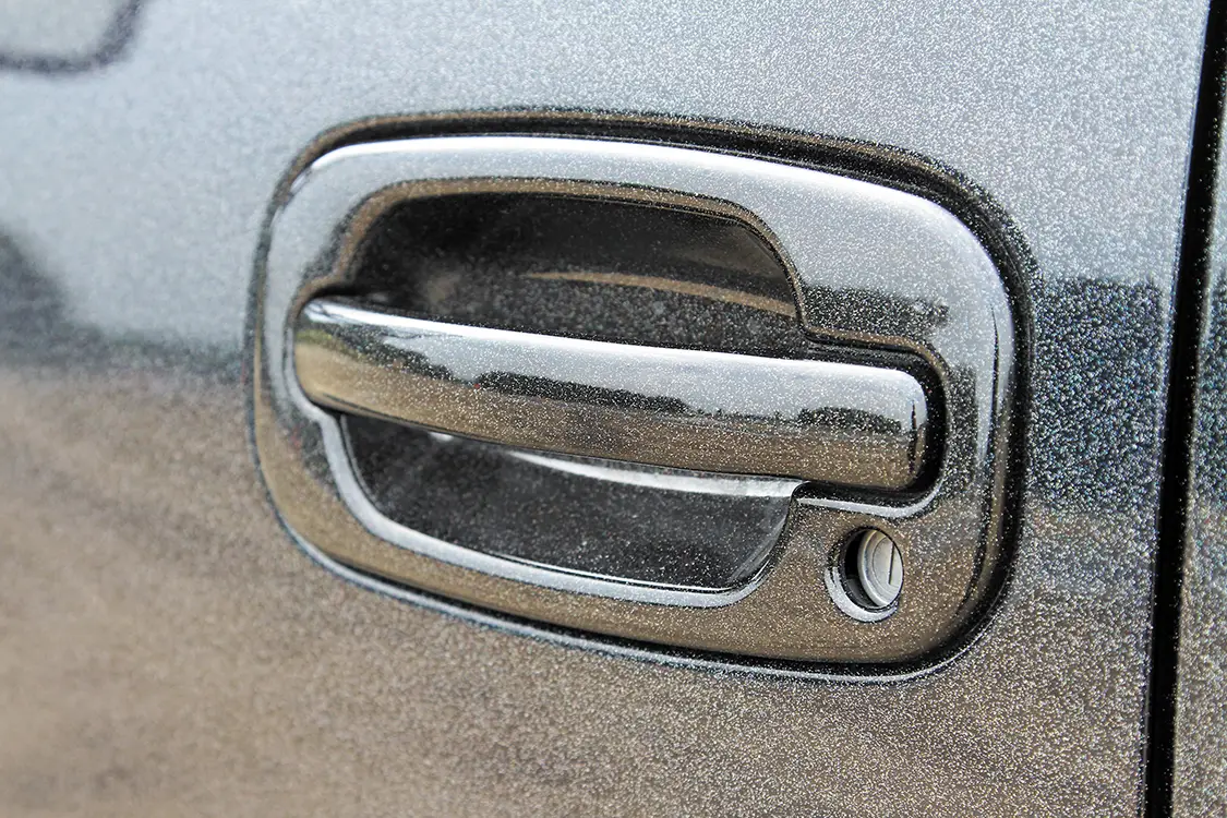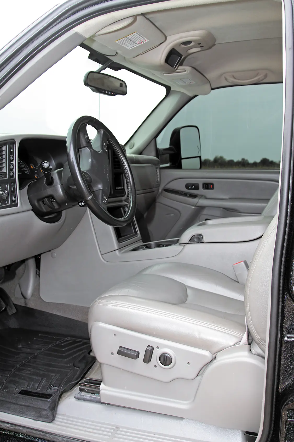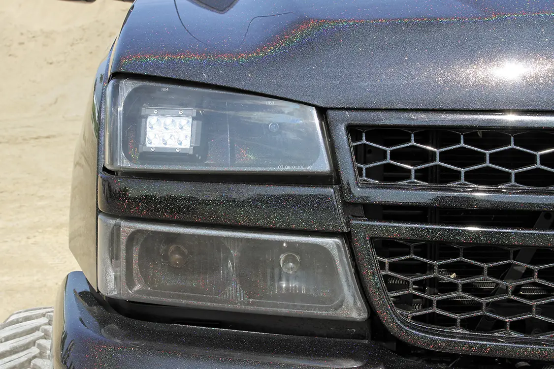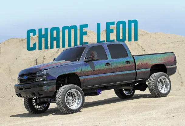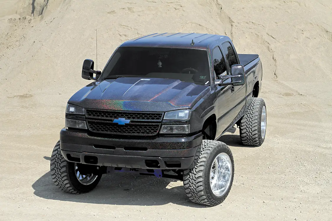 Published on October 14, 2025 Author Chris Tobin Share article Facebook 0 Twitter 0 Mail 0 2007 Chevy 2500HD: A Daily Driver Turned Showstopper Connor Stewart’s Flashy 2007 Chevy 2500 HD A show and competition trucks including powerful Duramax trucks, as well as a very clean 1st Gen Cummins Dodge, Connor Stewart intended this 2007 Chevy Silverado 2500 HD to be his standard daily driver. The twenty-seven year old New Lexington, Ohio, factory worker makes breakfast cereal by day and thoroughly enjoys diesel performance and diesel motorsports in his free time. Being hard pressed to drive a com- pletely stock truck, he planned to dress it up some by simply color matching the bumpers and giving the truck a fresh coat of factory silver paint since the truck wasn’t in perfect condition when he purchased it. “CUSTOM GALAXY GREY CANDY-PAINT OVER A BLACK BASE AND GENEROUS USE OF HEAVY FLAKES BURIED UNDER LAYERS OF CLEAR TOPCOAT FINISH”Subscribe Our Weekly Newsletter To give his truck the stance and ride he was after, Connor Stewart installed a 6-inch Rough Country suspension system and Rough Country Nitro 2 shocks with suspensioncomponents painted Illusion Blue to make it pop under the sparkly Chevy. Peeking under the rear of the truck, you can see the lift was accomplished with a set of fabricated steel Rough Country lift blocks and new U-bolts that were also painted Illusion Blue to match the front suspension components. You can also see the 5-inch MBRP exhaust system with its polished 6-inch stainless steel tip. Taking things to extremes is a reoccurring theme for Stewart’s truck and his 22X14-inch American Force wheels are no exception. His good friend Rick Jimenez polished the back side of the wheel to match the finish on the front in what we believe to be the first set of double-polished American Force wheels we’ve seen. Looking at the front suspension from the rear side you can see that the Rough Country system uses drop brack- ets for the torsion bars to retain a factory ride with additional altitude. HEAVY FLAKE Stewart took the Chevy to his friends Damon Hart and Jordan Windex at 923 Customs in Wooster, OH, to respray it, but the duo had other plans in mind. Since 923 Customs was a new shop at the time and they wanted to promote their busi- ness while showing off their paint capabil- ity they talked Stewart into allowing them to customize the truck. The one-off cus- tom finish is achieved with a custom Galaxy Grey candy-finish over a black base and obviously makes generous use of heavy flakes buried under layers of clear topcoat finish. Before spraying on the new color they smoothed the body repairing any imper- fections to give the paint a smooth sur- face to lie on. They also removed the moldings, badges and emblems as well as the rear bumper and replaced it with a smooth roll pan. All of the small items like the door and tailgate handles, mirrors and lights were also removed and prepped for paint. Out back the lights were simply smoked then painted to match, but up front they opened up the housings and painted the inside then reassembled the housings and even integrated an LED off road light into the outer headlight posi- tion. To finish up the body modifications, they installed a 3-inch cowl hood to give the truck a muscular feel then they sprayed everything in the wild Galaxy Grey candy paint to give it a totally unique look. “AMERICAN FORCE 22X14-INCH FALLOUT WHEELS” The front side of the American Force 22X14-inch Fallout wheels features a bright polished finish with color matched Galaxy Grey inserts that look different colors depending on the angle you look at them just like the truck. The massive wheels are wrapped in aggressive LT325/50R22 AMPM/T Terrain Master tires for good looks and traction. Of course, the bumper, grille and mirrors were painted to match as well. The blue Bowtie pops no matter the angle and the 3-inch cowl hood gives the truck an intimidating look. The amazing Galaxy Grey paint that the crew at 923 Customs laid on the truck takes on a different look from every angle looking black, grey and a full rainbow of bright colors depending on how you view the truck and the sun’s position overhead. Peeking under the cowl hood reveals a mildly modified LBZ Duramax with an S&B Filters cold air intake, resonator delete, Optima Red Top batteries and Sinister Diesel intake pipe to help make more power. STANCE After seeing the truck and its crazy fin- ish, Stewart knew he couldn’t let the rest of the truck stay stock, so he installed a 6- inch Rough Country suspension system. But he decided to make the suspension components stand out to fit the truck and painted them Illusion Blue. Rough Country Nitro 2 shocks tame the ride in the front and the rear. Even when lifted, this truck wouldn’t look right with run of the mill wheels and tires, so Stewart turned to American Force for a set of 22X14-inch Fallout wheels. But rather than install them on the truck right away he sent them off to his friend, Rick Jimenez, to polish the back side of the wheel to match the finish American Force provides on the front side. While Jimenez was working on the wheels, the 923 Cus- toms crew painted the bolt-on aluminum trim plates Galaxy Grey to make the wheels pop and link them more directly with the custom painted truck. After the wheels were finished, Stewart mounted a set of aggressive LT325/50R22 AMP M/T Terrain Mas- ter tires to finish the truck’s transfor- mation from ho-hum to flashy. Stewart’s interior is stock but comfortable grey leather with Weather Tech mats to protect the carpet as the truck is a daily driver after all. They also customized the parking lights and headlights by painting the insides and integrating a small LED offroad light in the outer positions. DURAMAX POWER Stewart was fine with the factory grey leather interior as it was in good shape and the dark tinted windows would keep prying eyes out, so he kept it stock for now. But it would be ha