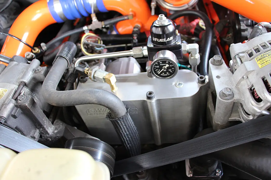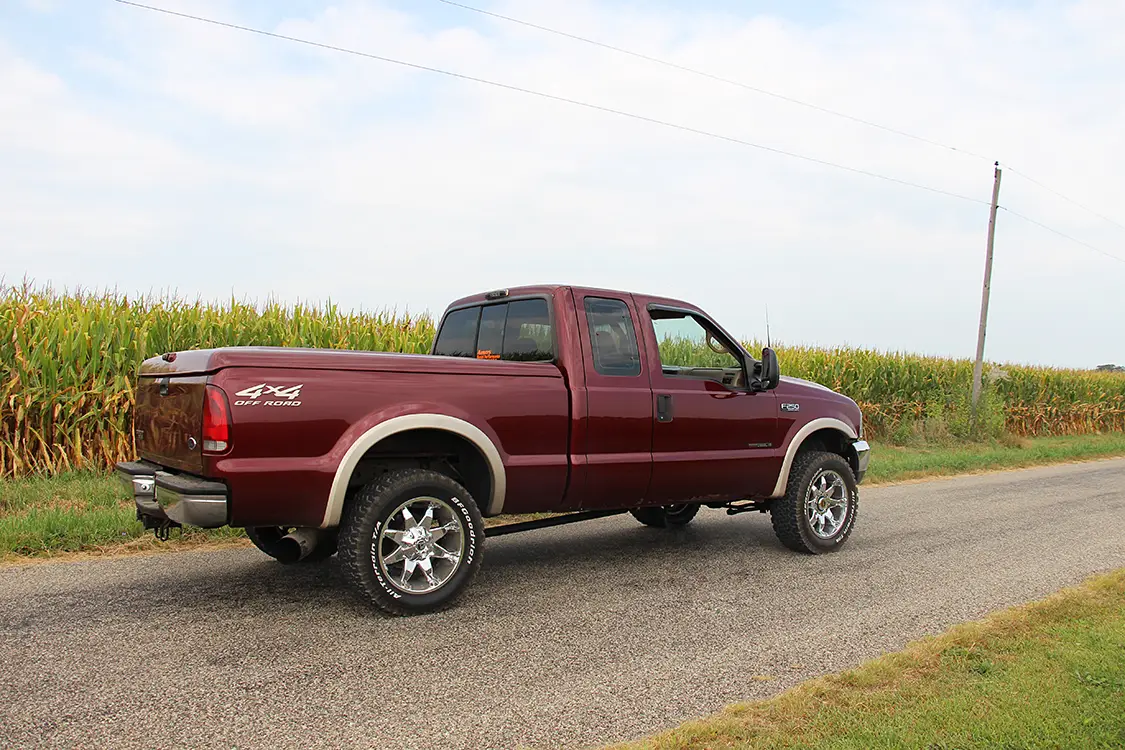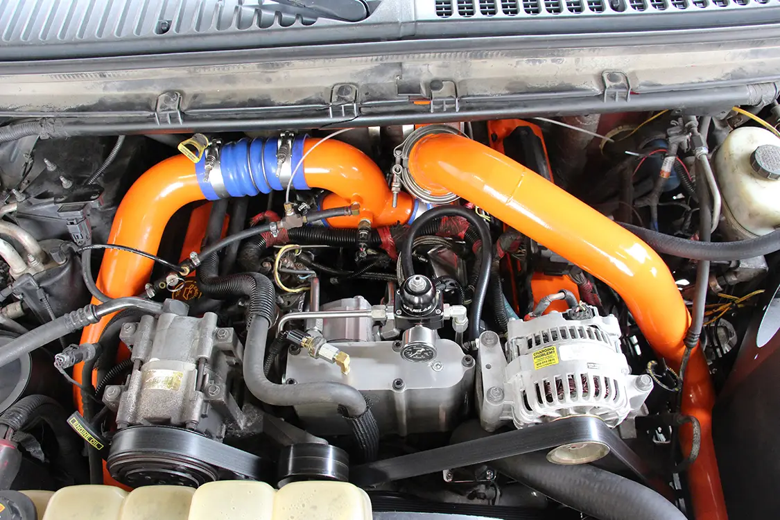 Up next Diesel Essentials: Power, Precision, and Performance Gear for Every Truck Published on October 09, 2025 Author Mike McGlothlin Share article Facebook 0 Twitter 0 Mail 0 A 7.3L Power Stroke That Packs a Punch A Nasty 7.3L Packing Big Fuel, Oil, and Air Durable, dependable, and reputable. While virtually no one will argue the 7.3L Power Stroke doesn’t live up to these words, the venerable, HEUI-injected, large displacement V-8 isn’t particularly thought of as a good foundation for making big horsepower. But that’s exactly what motivated Shawn Matz to make his ’00 F- 250 anything but your average, run-of-the-mill Super Duty. It was built to put newer trucks in their place and showcase the capability of the 7.3L. “Everybody, every step of the way, has told me I’ll never make much power, so I set out to prove them wrong,” he told us. “EVERYBODY, EVERY STEP OF THE WAY HAS TOLD ME I’LL NEVER MAKE MUCH POWER, SO I SET OUT TO PROVE THEM WRONG.” —SHAWN MATZ After killing the factory forged rod engine (and a spare while this mill was being put together) Shawn Matz pulled out all the stops when he built the 7.3L Power Stroke currently residing in his ’00 F-250. Built like a tank, the cast-iron V-8 utilizes a girdle, Carrillo forged rods, valve-relieved and coated cast-aluminum pistons, a Gearhead Automotive Performance Stage 2 sled cam, and fire-rings in the block. Top end modifications include a set of ported heads (courtesy of Crutchfield Machine in Liberty, North Carolina) with Stage 2 beehive valve springs and Stage 2 chromoly pushrods from Swamps Diesel Performance. A T4 turbo mounting system from Irate Diesel Performance, complete with stainless steel uppipes and intercooler piping, makes running an S400 based charger possible. The big single was built by Turbo & Diesel Injection of Indianapolis and features a billet 75mm compressor wheel, 96mm turbine wheel, and a 1.10 A/R exhaust housing. The Kelly Group Powdercoating of Lafayette, Indiana, finished the intercooler plumbing and compressor housing in “caution” orange. As for fuel, 400cc hybrid injectors with 400-percent over nozzles from Full Force Diesel dwell in the heads (commonly called 400/400’s). Meeting the big injectors’ oil demands is the proven Gen3 high-pressure oil pump from Swamps Diesel Performance, which mounts above the OEM 17- degree HPOP. NOT MESSING AROUND Purchased with 250,000 miles on the clock, Shawn wasted no time modifying the untouched 7.3L under the hood. Thanks to a set of 300/200 (300cc flow/200-percent over-sized nozzles) hybrid injectors, S475 turbo, and a built transmission, the truck was soon knocking on the door of 600- rwhp. However, at the 330,000-mile mark, the stock bottom end decided it’d had enough—which only prompted Shawn to do a full-on engine build and push the envelope even further.Subscribe Our Weekly Newsletter On the fuel supply side, the factory filter bowl and corresponding hardware has been removed from the lifter valley and an AirDog II system is utilized for filtration along the frame rail. However, Shawn uses a Fuelab Prodigy series lift pump to send fuel to the engine. A Fuelab regulator keeps a consistent 70-psi on tap for the injectors. NEW BOTTOM END Getting started at Diamond Engine and Machine in Monticello, Indiana, a fresh block was machined and cut to accept fire-rings. From there, a new rotating assembly—which included Carrillo forged rods and fly-cut (and coated) cast-aluminum pistons—was balanced. For good measure, Shawn included a main bearing girdle of his own design in the build. Wanting the 7.3L to breath a bit better, Shawn had the factory-based heads ported by the folks at Crutchfield Machine in Liberty, North Carolina. Further aiding airflow and helping to drive the large single turbo in the valley is a Stage 2 “Sled” cam from Gearhead Automotive Performance. Once back from the machine shops, all engine assembly was left in the care of nearby Amos Diesel Performance in Michigantown, Indiana. “AT THE 330,000-MILE MARK, THE STOCK BOTTOM END DECIDED IT’D HAD ENOUGH” A set of traction bars from Harness Machine & Fab rules out any rear wheel hop and axle wrap. Beyond that, the truck has chromoly axle shafts all the way around, as well as a Grizzly locker in the rear end. Ushering the 2000 model-year Super Duty into the modern age are front captain’s chairs from an ’08 King Ranch and a roomy center console from the same King Ranch donor. FUEL AND OIL Going beyond the 300/200 hybrid injectors that landed the truck in the 600-hp range, a set of Full Force Diesel 400/400 units stepped up the fuel game considerably. Keeping the oil side of the HEUI equation happy is a Gen3 high-pressure oil pump from Swamps Diesel Performance. Fuel supply consists of an AirDog II for filtration, a Fuelab pump feeding the engine, and a regulated return fuel kit from Irate Diesel Performance. The 4R100 automatic behind Shawn’s potent 7.3L is built to handle plenty of abuse. A 2,500-rpm stall triple disc, billet torque converter not only makes the S475 very drivable, but a heavy-duty billet stator all but eliminates a common failure point. The rest of the slushbox consists of a Sun Coast pump, Raybestos clutches, Sonnax billet input, intermedi- ate, and output shafts, and a valve body set up to Shawn’s liking. Every serious drag racer has one of these mounted somewhere in the cab: a torque converter lockup switch. Having complete control over lockup is something most high-powered diesel owners prefer at the track, and Shawn is no exception. COMPRESSION The job of creating boost is left to a billet S475 dwelling in the valley. Built by Turbo & Diesel Injection, it features a massive 96mm turbine wheel, 1.10 A/R exhaust housing, and a T4 flange. Thanks to a complete T4 turbo mounting system from Irate Diesel Performance, the hefty snail (aka turbo) packages very well under the hood. At full tilt, more than 60 pounds of boost makes its wa