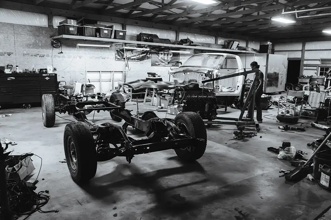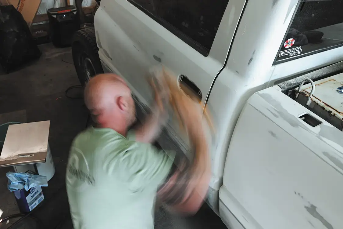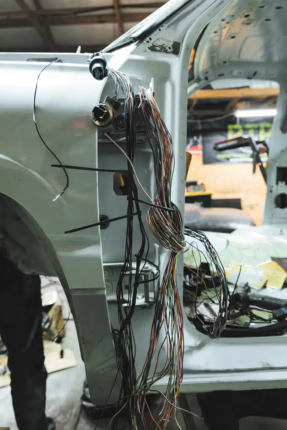 A lot has happened in the past month. Tyler and the gang have been on full kill mode making this truck a true one-off machine to show this year in Las Vegas! From getting the engine all the way down to nothing, plus minimizing the wiring harness to hide within the body panels, there has been a great deal of work put in. We even had our buddy Devan Ence, editor of F-Series Builder’s Guide and Tread magazine, come out and put his skills to the test by getting the truck smoothed out and bodyworked in just a few short but long days out here in Oklahoma.