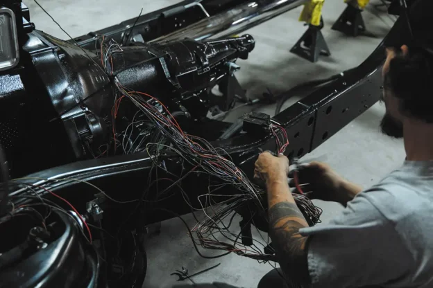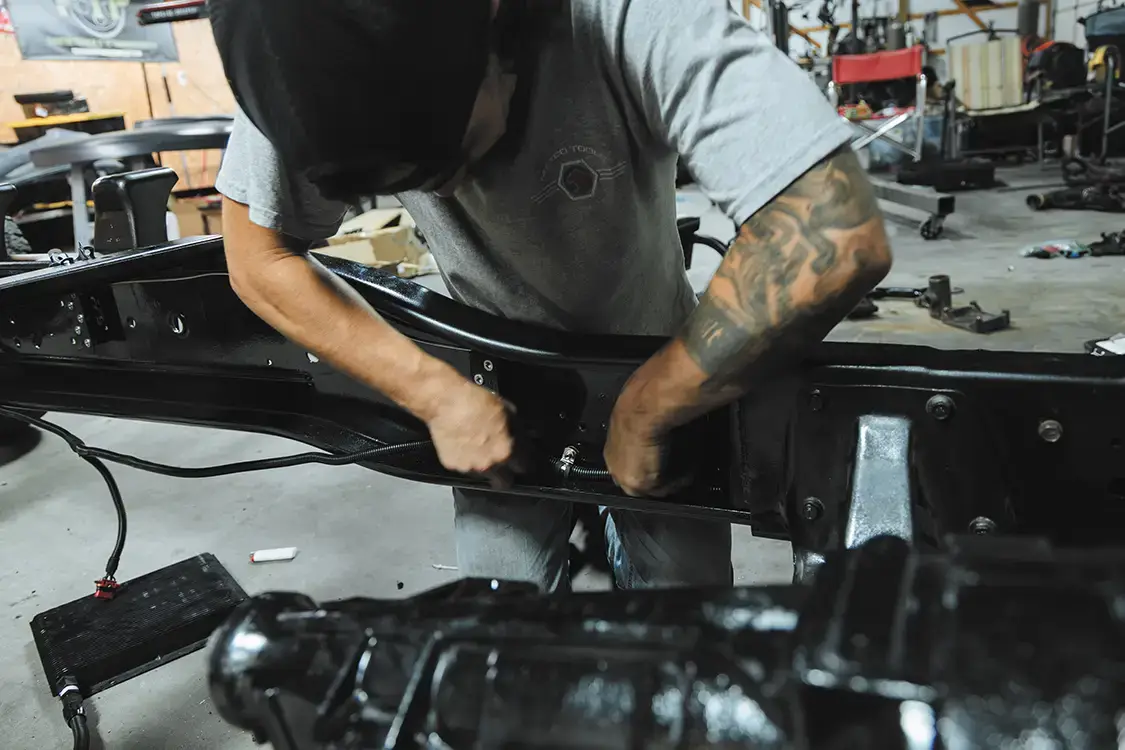 Tyler has been showing off his visions of hiding all of the plumbing and wiring not only under the hood but also along the frame rails using the Far From Stock frame rail mounts, which are great for managing fuel and brake lines, our FASS harness, and all other wiring harnesses. We’re also relocating the batteries, so this is a good way to run the wires for the starter and fuse box to keep them out of the way and tidy. After some long, grueling hours of bending lines and running wire loom and tape, this masterpiece is finished and ready to power up once the body goes back on.