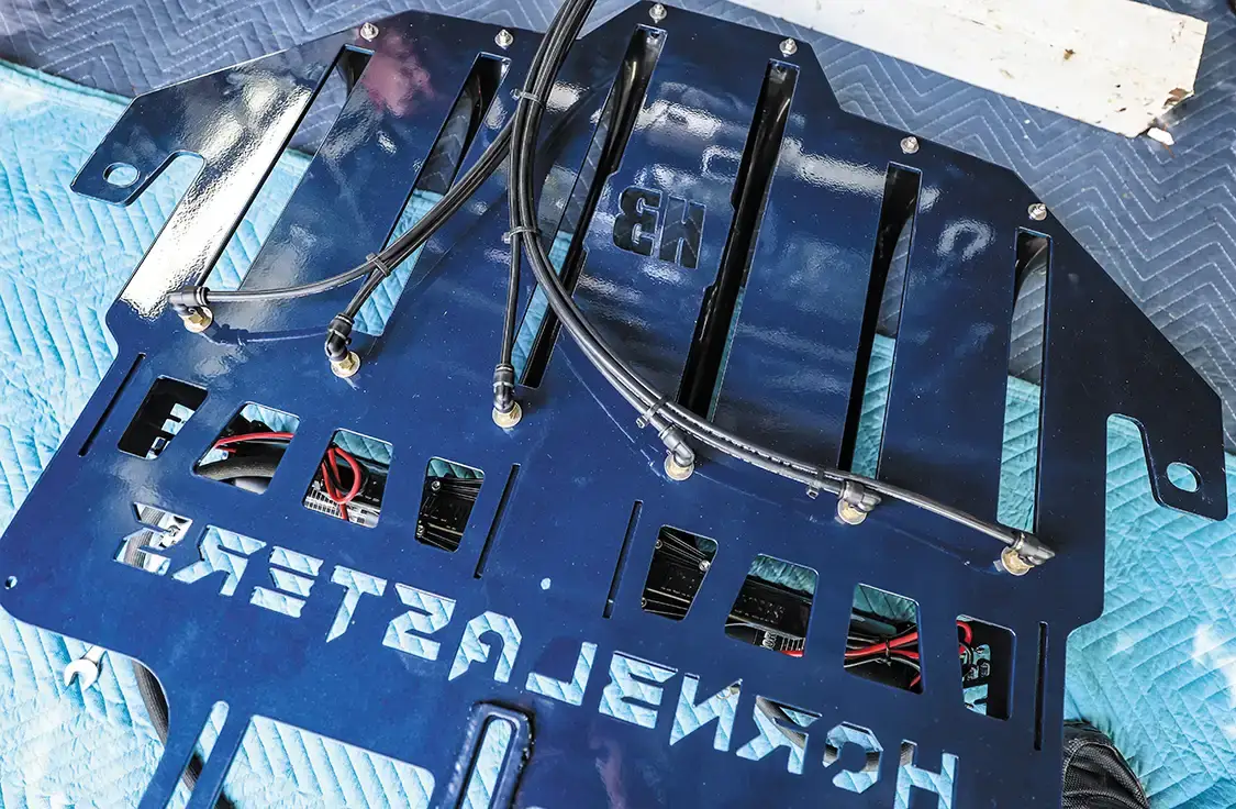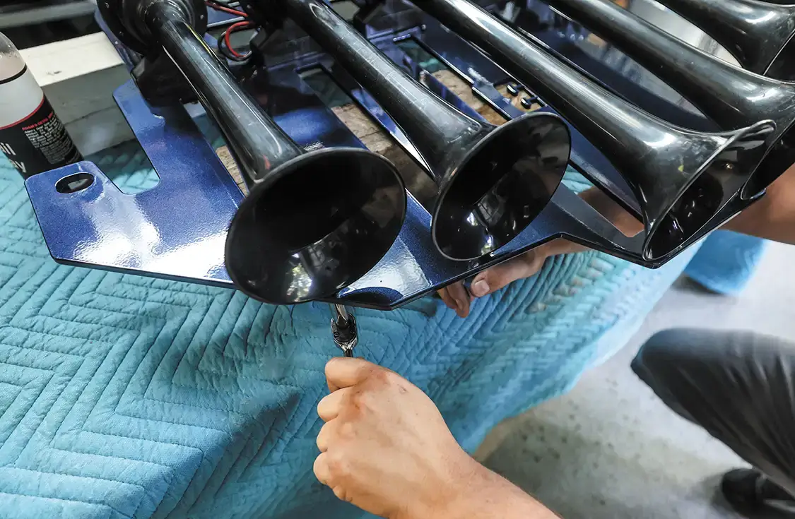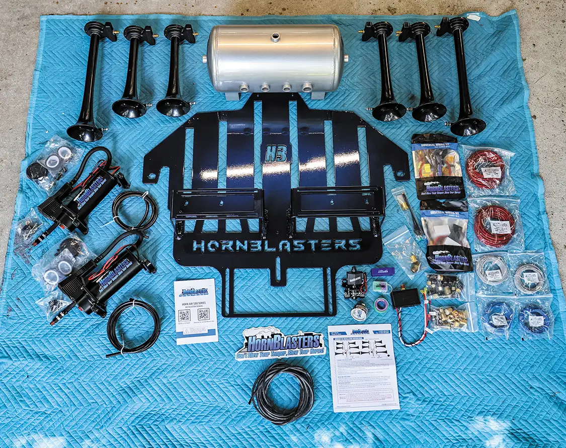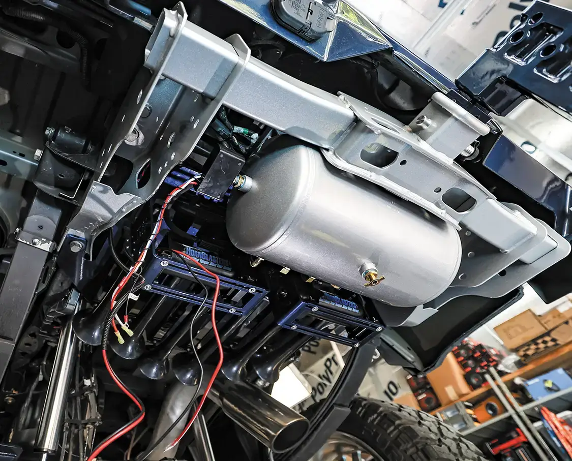 Up next How to Fix a Cracked Dipstick on Your 12-Valve Cummins (1994–1997) Published on July 03, 2025 Author BRANDON BURRELL Share article Facebook 0 Twitter 0 Mail 0 Installing Train Horns on a Ford Super Duty with HornBlasters Installing Train Horns on a Super Duty If you are reading this article, I’m pretty sure you have been around someone with train horns on their truck. Whether it’s a friend you know who likes to scare people with them or some random truck you passed that scared the crap out of you with their horns. Not only are loud train horns fun to play with but they also add a side of safety to your truck that doesn’t come from the factory. If someone pulls out in front of you or comes into your lane, the sheer volume from a set of train horns gets their attention way faster than the factory horn does. When we knew we wanted to add a set of train horns to this 2017 Ford F250, we reached out to our friends over at HornBlasters, who have dominated the train horn sector of the industry since 2002. With all of the parts needed laid out, you can ensure you have what you need before you start. The mount and tank have been powdercoated before anything was assembled. HornBlasters has a wide variety of kits and options for mounting its horns as well. Everything from spare tire delete kits that allow you to mount the tank, air compressors, and the horn trumpets where the factory spare goes under the bed of the truck, to a few vehicle specific kits are available. Of course, you can do a custom mount, but fabrication of one-off brackets isn’t in everyone’s wheelhouse. Wanting to mix a custom-looking install with the ease of a spare tire delete, we opted for the HornBlasters Goliath horn mount. This mount goes into the spare tire spot under the bed but is a bolt-in mount versus the standard spare tire delete mount that uses the spare tire cable to pull the mount into place and secure it. This mount is built specifically for this model truck, but HornBlasters offers other mounts for various other models. First, we installed the inlet filter fitting into each compressor. It’s easier to access these before they are installed. This specific mount utilizes two of the factory receiver mounting bolts to secure it, as well as a third bolt on the other end that must be added. It holds two HornBlasters compressors as well as a 5-gallon air tank, and 6 HornBlasters trumpets. The kit comes with every fitting, wire, and connector needed for a full installation. The metal mount comes in bare metal so you can paint or powdercoat it to your needs. For this install, we went with a blue and silver powdercoating combo to match the rest of the truck, which had a huge Stryker Off Road lift kit and a ton of parts that were already powdercoated. Even though the factory receiver didn’t have to come off to install these parts, we went ahead and pulled it off and had it powdercoated as well. This way, the entire underside of the rear of the bed would be highly detailed and make for a better showpiece.Subscribe Our Weekly Newsletter Follow along as we give you the basic idea of how this killer parts combo goes in and what the final outcome looks (and sounds) like. This is one loud install! Using the supplied hardware, both compressors were installed into the mount. Setting the plate face up on a table will give you plenty of access to all mounting spots on the plate. Next, the air tank was bolted to the mount. After test-fitting the plate under the truck, we marked where the third mounting bolt goes and drilled a hole for a nutsert to be installed. Next, we installed a nutsert into the new hole. This will receive a bolt to avoid having to use a nut on the backside since it can’t be accessed anyway. Back to the mounting plate, we installed all six trumpets, being sure not to over tighten them. We then flipped the plate over and installed the swivel air fitting onto each trumpet. We secured the supplied HornBlasters air valve under the truck, but after we installed both fittings. This way, you just have to plug in the air lines once the mounting plate is installed. We then began cutting the air line we would need, making sure to make clean and even cuts. Jagged or uneven cuts could result in unwanted air leaks. The supplied air line was then plugged into each of the trumpet quick-connect fittings, making sure the line was securely seated into the fitting. We zip-tied the six air lines into one bundle and routed them towards the front of the mounting plate to be plugged into the air fitting later. Once we figured out the placement of all the needed fittings in the tank, we made sure to apply thread sealant to help avoid air leaks. Due to the weight of the fully assembled mount, we grabbed a few friends, lifted it into place, and secured it with the two factory receiver bolts—one on each side. We then installed the third mounting bolt into the nutsert we installed in step 6. Now that all three mounting bolts were tightened, we made sure that no moving parts or the exhaust was in the way. If anything looks to be in the way, now is the time to move it. After all power connections were made and the air lines were plugged into the air valve, we made sure everything was zip-tied out of the way. The mounting plate was now complete. The pressure switch was installed into the end of the tank and the wires were routed out of the way so they were as hidden as possible. We made sure all connections are made per the instructions. The pressure switch was installed into the end of the tank and the wires were routed out of the way so they were as hidden as possible. We made sure all connections are made per the instructions. The final step was to connect the power wire to the battery and install the supplied fuse. Also, the air valve power wire could be made to either a momentary push button, or as we did, directly to the factory horn. Now, when the steering wheel button is pressed, the factory horn and train horns